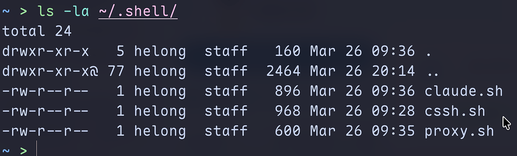 为了避免所有内容全都堆在 .zshrc 中,我把自定义逻辑单独放在一个目录里: