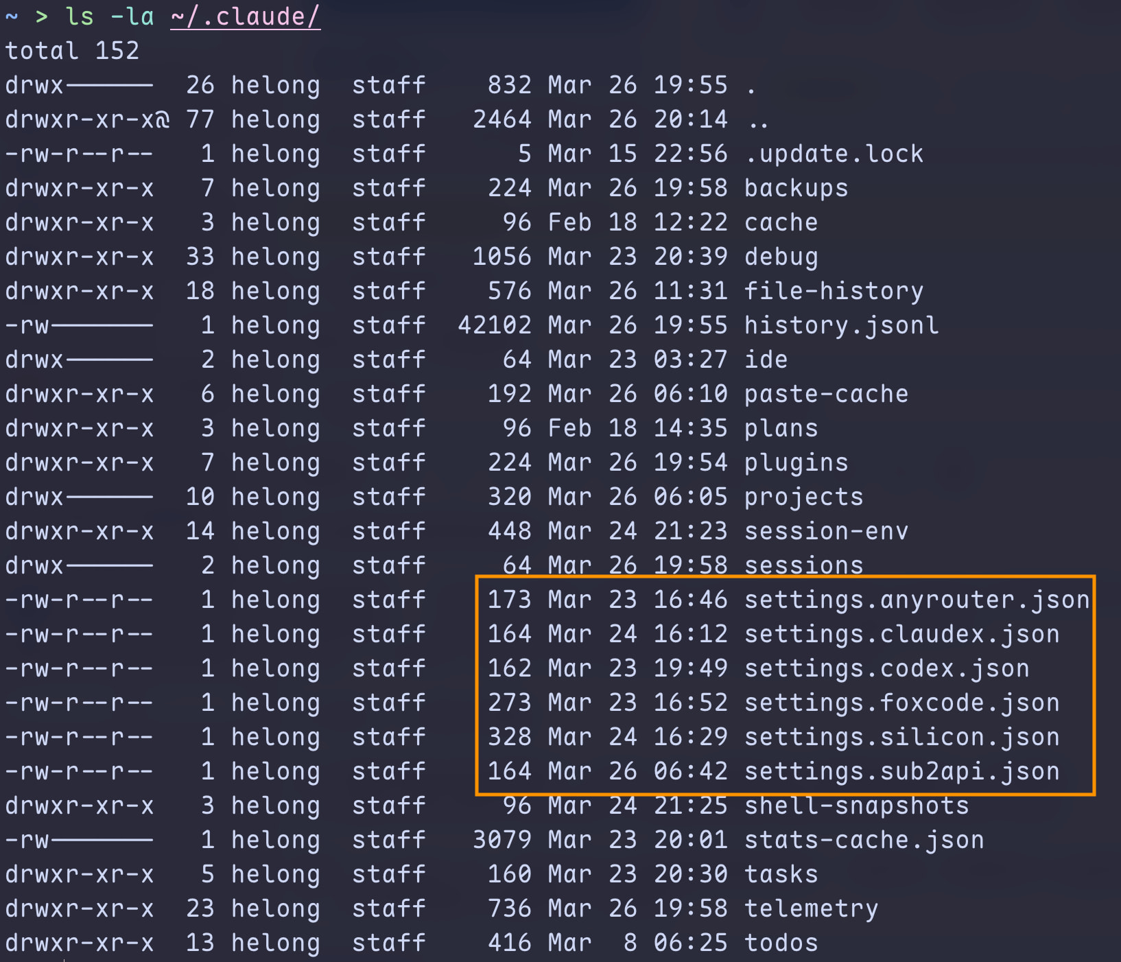 claude.sh 是针对claude配置切换的函数,一般来说,在使用多个公益站情况下,我们会创建多个配置文件,像这样: