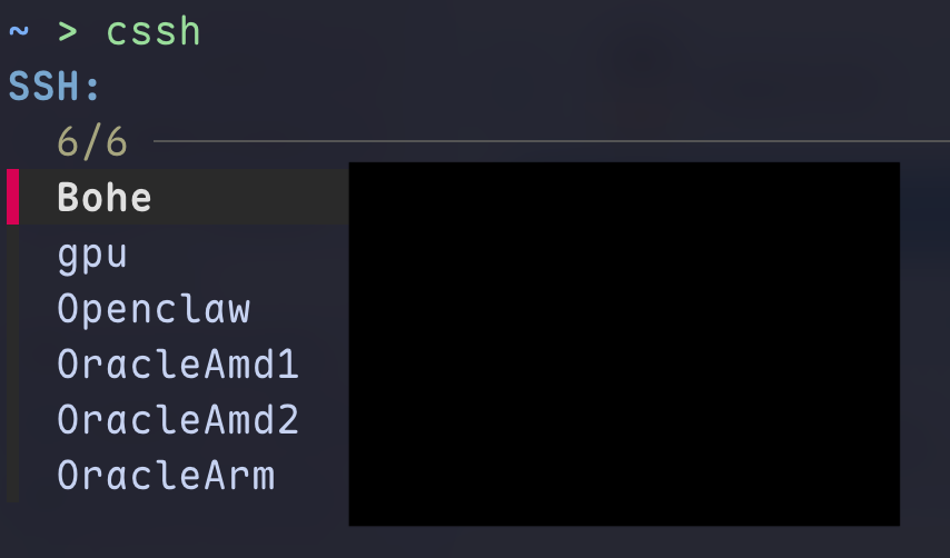 User ab可以通过 cssh 列出所有的配置选择连接,这个功能依赖 fzf :